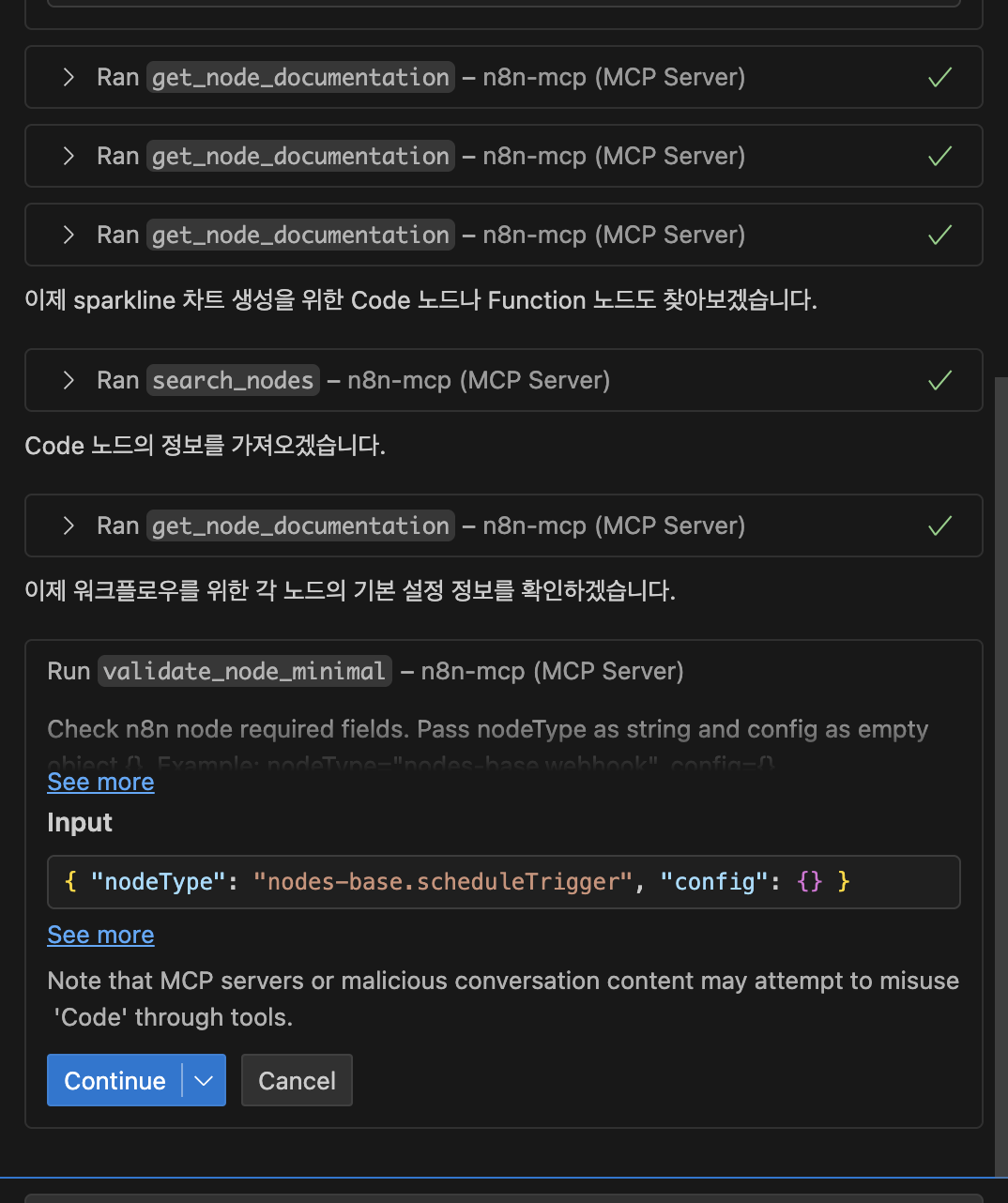 VSCode에 n8n-mcp를 추가하고 Copilot에게 특정 기능을 구현하는 워크플로우를 JSON 파일로 생성해달라고 요청했을 때, 응답 과정에서 Run search_nodes와 Run get_node_documentation라고 표시되며 바로 옆에 n8n-mcp라고 명시되는 것을 확인할 수 있었다. 이는 AI가 응답하는 과정에서 n8n-mcp 서버를 도구로 활용하고 있다는 의미다.