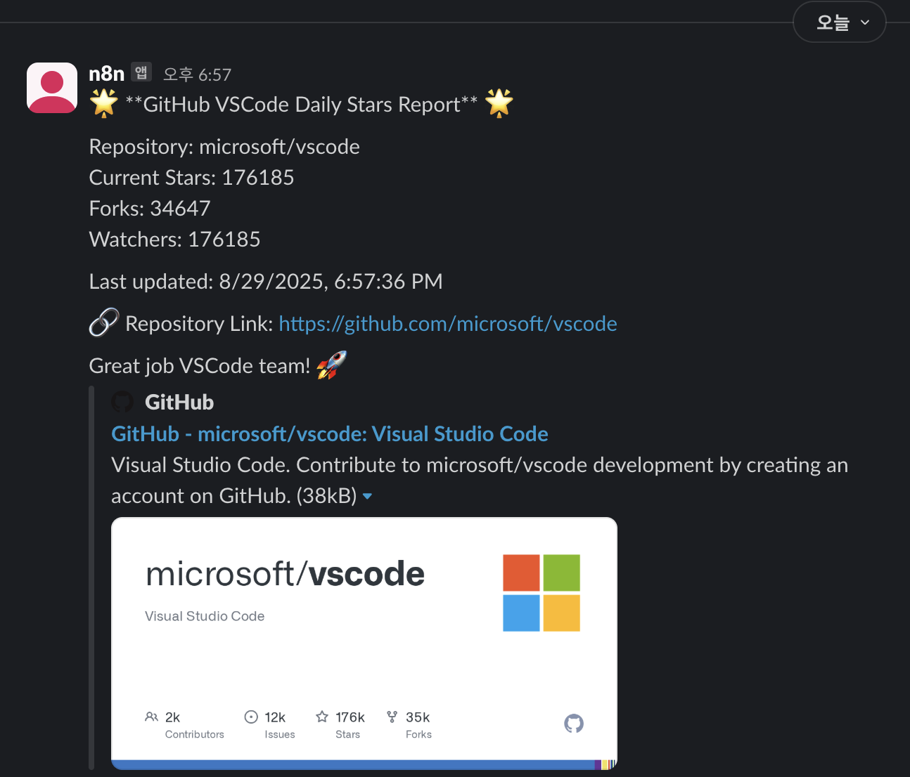 발표에서는 실제로 Microsoft의 VSCode 리포지토리의 Star 개수를 매일 아침 9시에 Slack 채널로 알려주는 워크플로우를 생성하고 배포하는 과정을 시연했다. 이를 통해 n8n-mcp가 단순히 코드를 생성하는 것을 넘어서, 실제 n8n의 최신 노드 정보에 접근하고 작동하는 워크플로우를 만들어주는 강력한 도구임을 보여주었다.